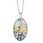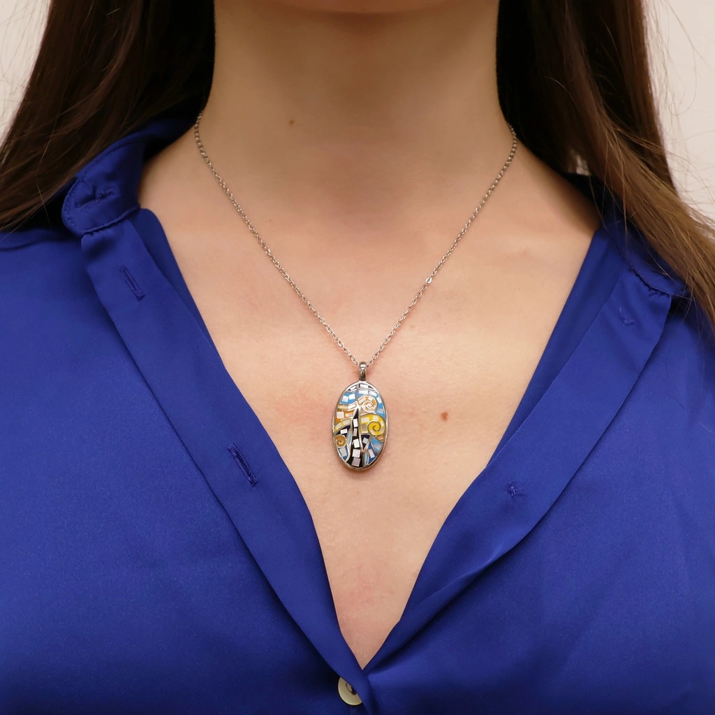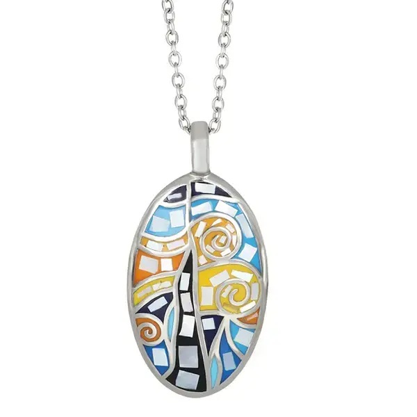 Овалният медальон от неръждаема стомана е с артистична мозайка в нюанси на синьо, жълто и оранжево, напомняща за известния стил на рисуване и добавяща креативен щрих към всяко облекло.