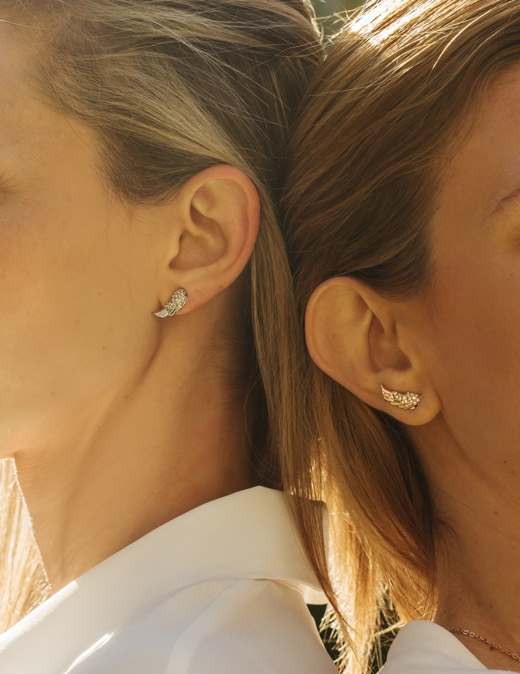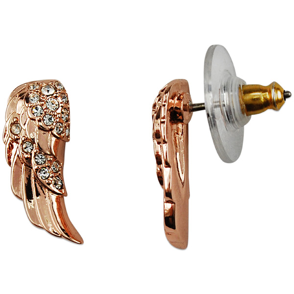 Позлатените обеците "Ангелски криле" са с романтичен дизайн във формата на крило с дължина 1.9 см, декорация от бели кристали и покритие от розово злато.