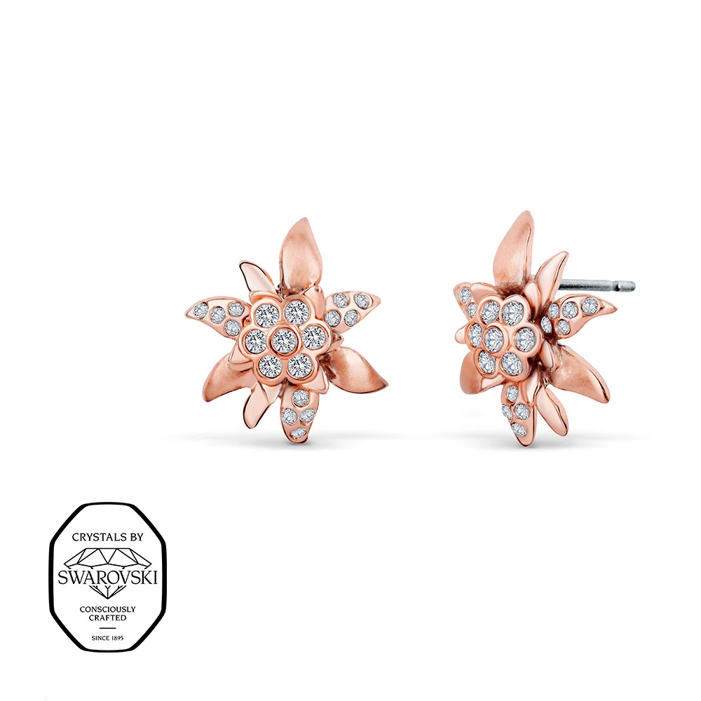 Обеците "Edelweiss" са изработени от медицинска стомана с покритие от розово злато и са озарени от бели кристали Сваровски.