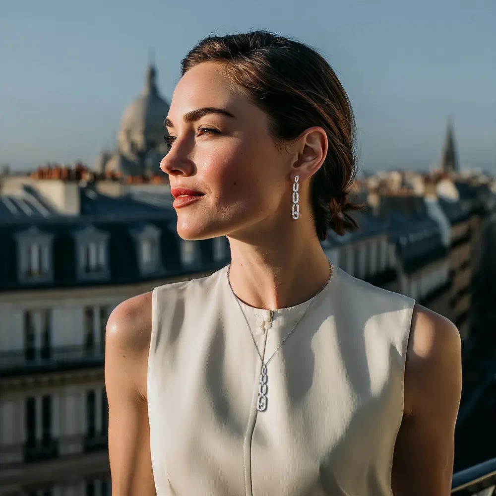 Фината декорация от кристали Сваровски добавя фино сияние на тези висящи обеци верижки и ги прави изразително бижу, което съчетава градски чар с вечна елегантност.