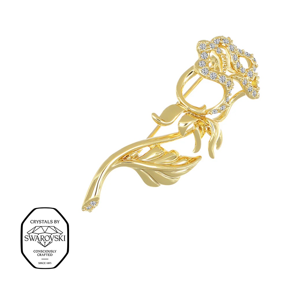 Позлатената брошка "Rose Deluxe" комбинира романтичен символизъм с луксозен блясък.