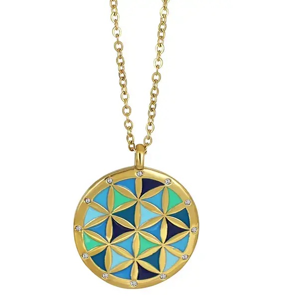 Това интересно колие е хипоалергенно, изработено от висококачествена медицинска стомана 316L, ръчно изрисувано е с мозаечни елементи и инкрустирано с кристали, които създават нежен отблясък.