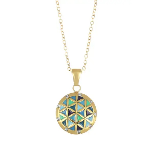 Това интересно колие е хипоалергенно, изработено от висококачествена медицинска стомана 316L, ръчно изрисувано е с мозаечни елементи и инкрустирано с кристали, които създават нежен отблясък.