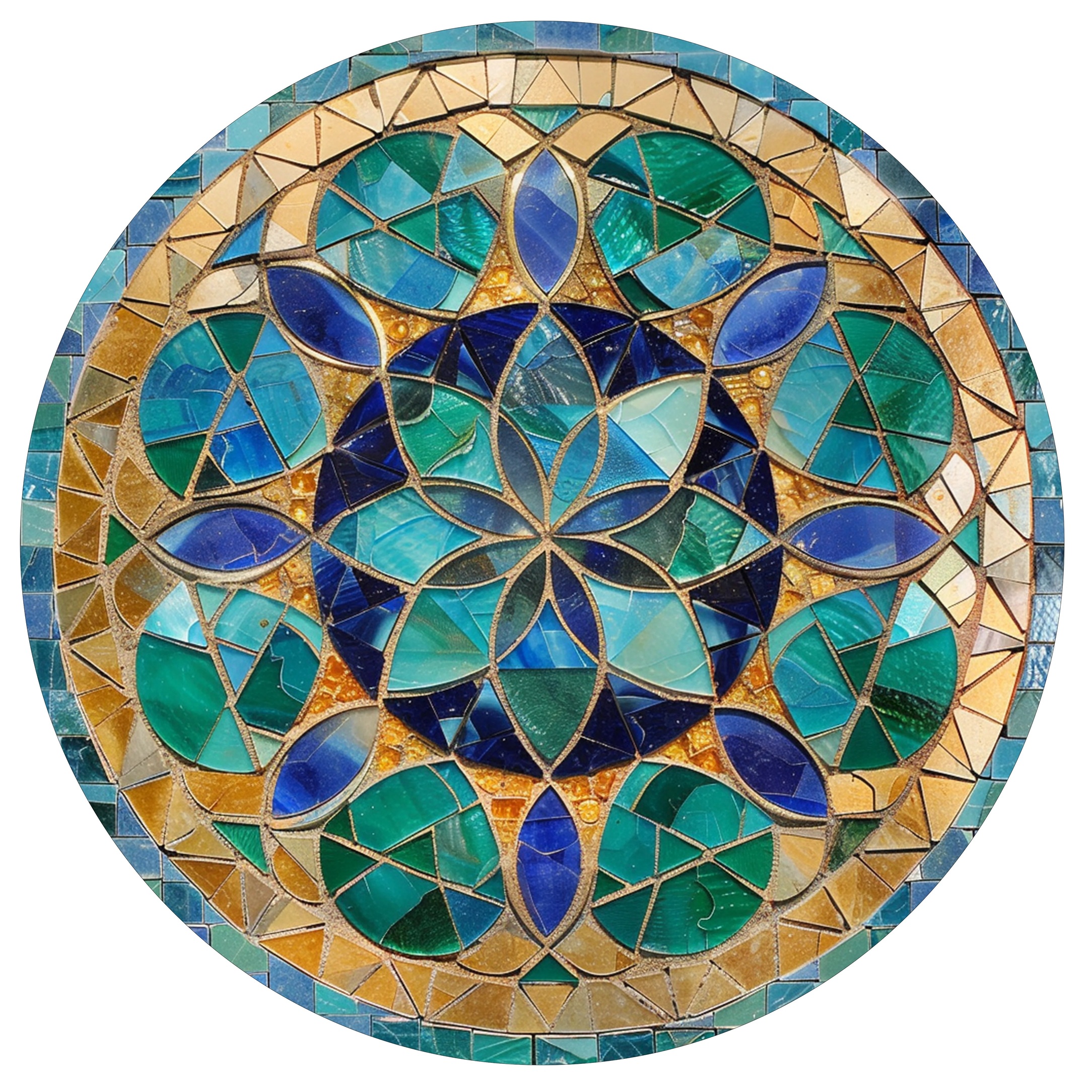 Кръглата висулка е с дизайн на деликатна мозайка в нюанси на синьо и зелено, оградена от блестящи кристали, които придават на дизайна изтънчена привлекателност.
