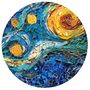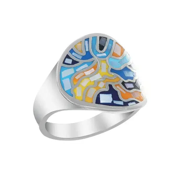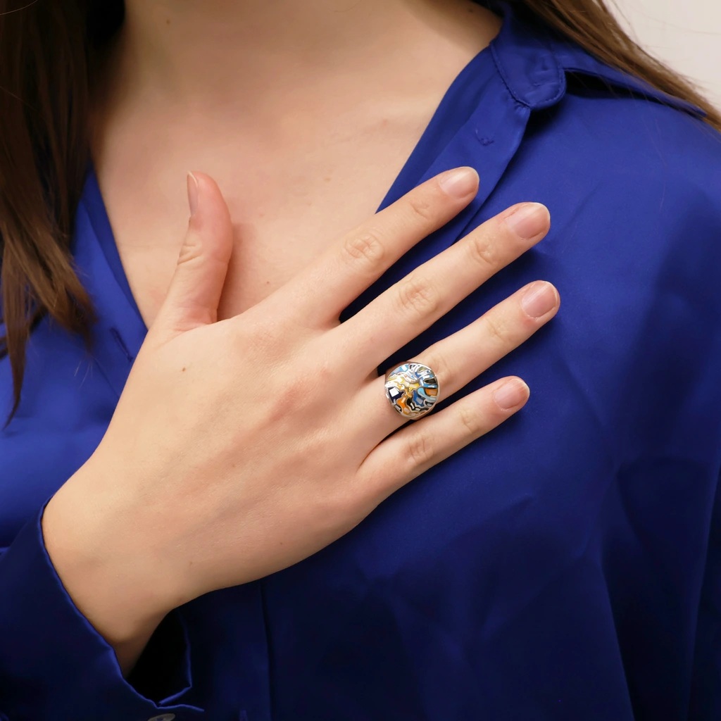 Пръстенът "Starry Night“, изработен от лъскава неръждаема стомана, пленява с цветния си мозаечен дизайн в нюанси на синьо, жълто и оранжево.