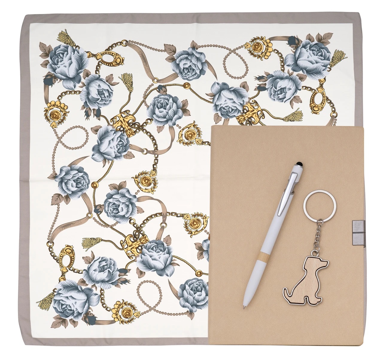 Елегантен сет в натурални тонове: тефтер с мека корица, бяла химикалка с бамбуков акцент, дамски шал и бамбуков ключодържател във формата на куче.