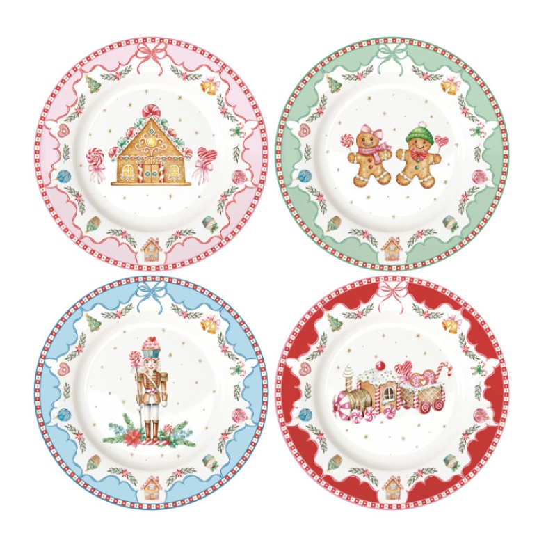 Комплектът "SWEET CHRISTMAS" включва 4 броя порцеланови чинии с весел коледен дизайн и с големина от 19.5 см.