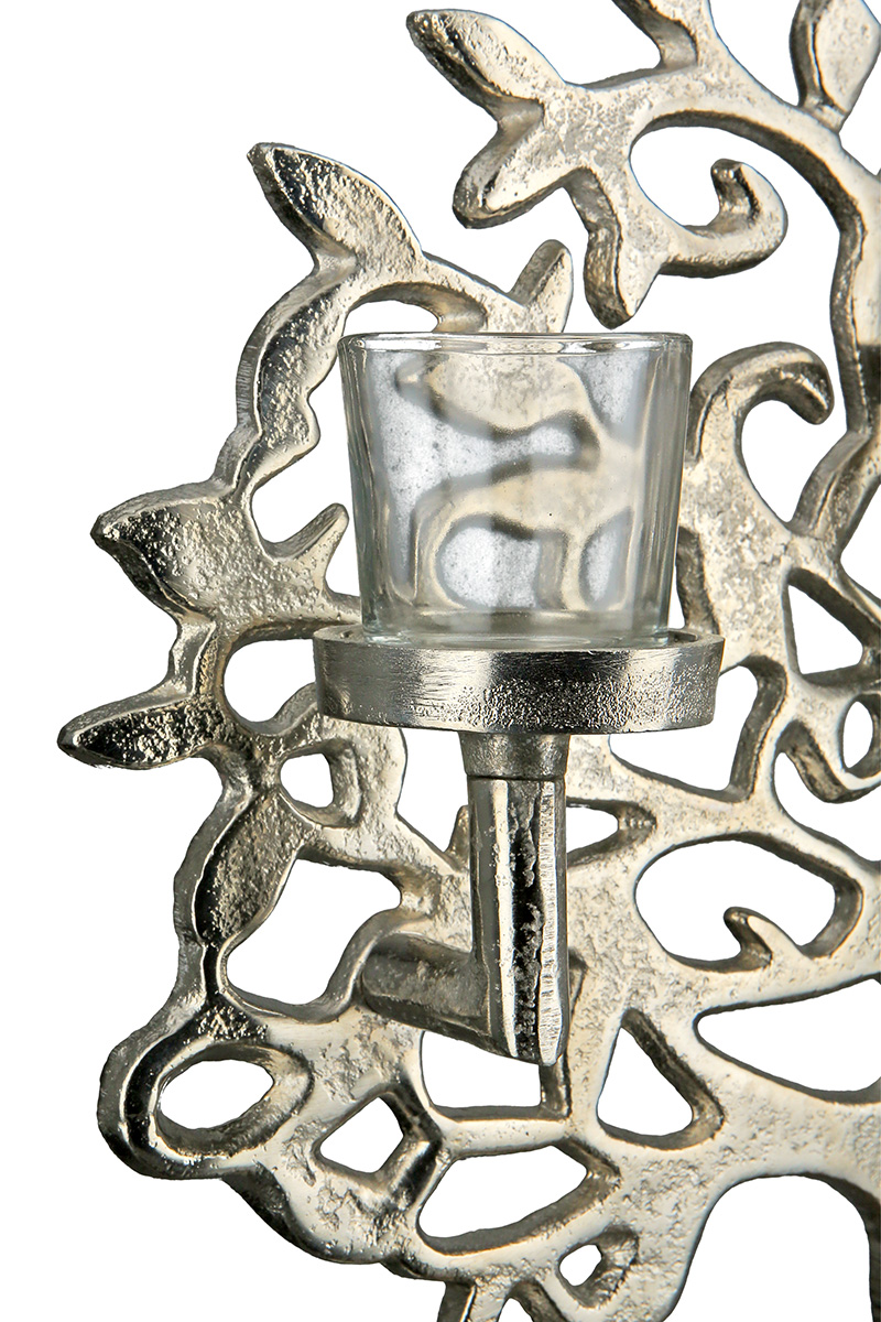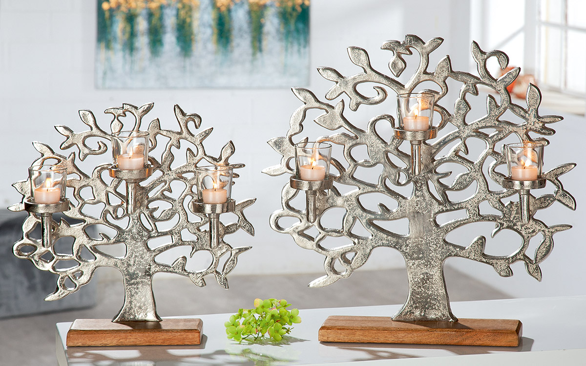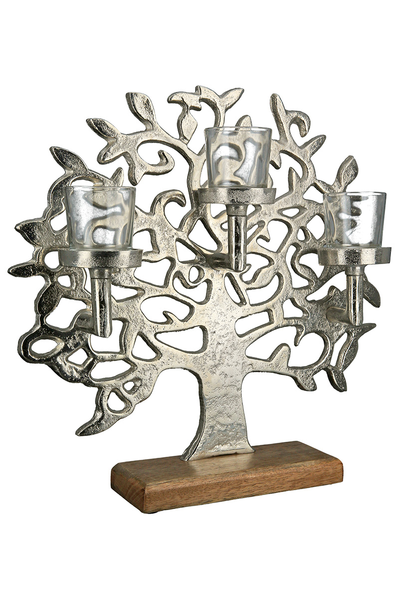 Този елегантен свещник с претворено дърво на живота с три поставки за чаени свещи ще озари и придаде колорит на вашия домашен или офис интериор.