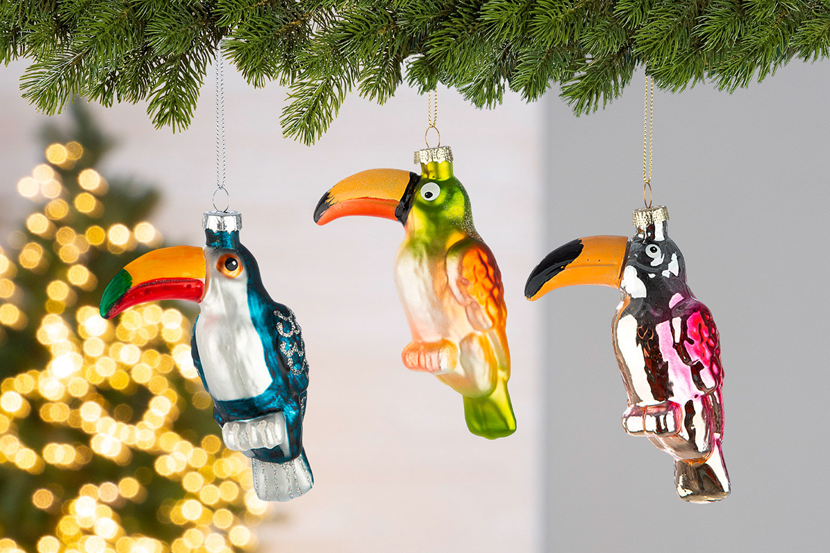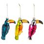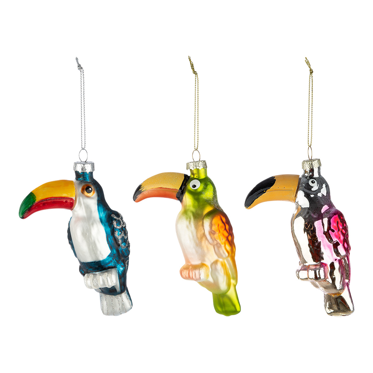 Туканите са изработени от стъкло и са изрисувани в ярка палитра от цветове.